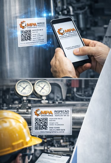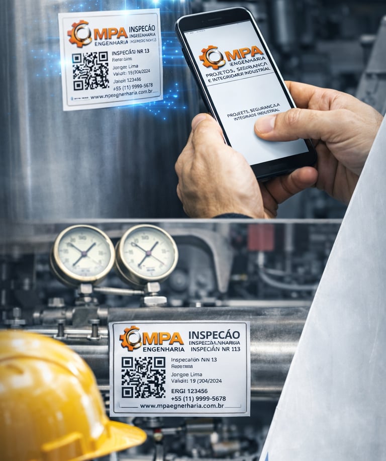 Cada equipamento inspecionado pela MPA Engenharia recebe uma identificação digital exclusiva por QR Code, permitindo acesso imediato ao histórico técnico, registros de inspeção e ao último laudo emitido. Essa tecnologia garante maior organização, rastreabilidade e transparência na gestão de equipamentos industriais.